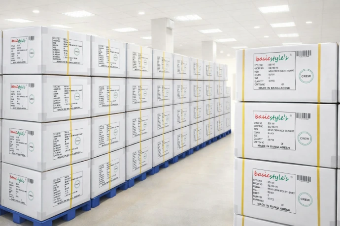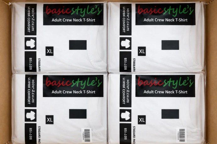 Once approved, garments are folded, poly-packed, and prepared for shipment according to program requirements. Packaging formats are designed to support bulk wholesale shipments, institutional distribution, and downstream retail or future e-commerce fulfillment.