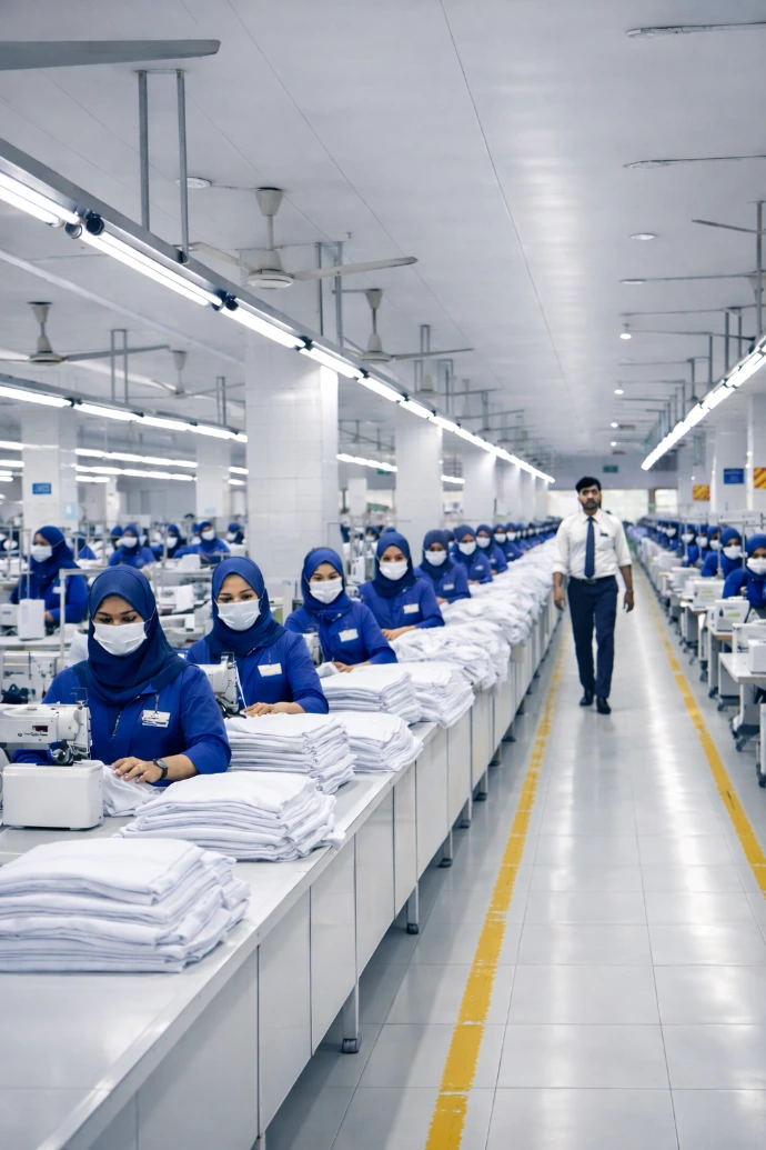 Following cutting, garment components move through organized sewing and assembly lines. Skilled operators and industrial sewing equipment are used to assemble garments according to defined construction standards.