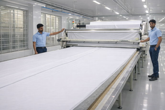 Manufacturing begins with fabric inspection and preparation. Incoming fabric is evaluated for consistency, defects, and suitability before entering production. Fabric is then spread and cut using standardized patterns and industrial cutting equipment to ensure accuracy across sizes and production batches.